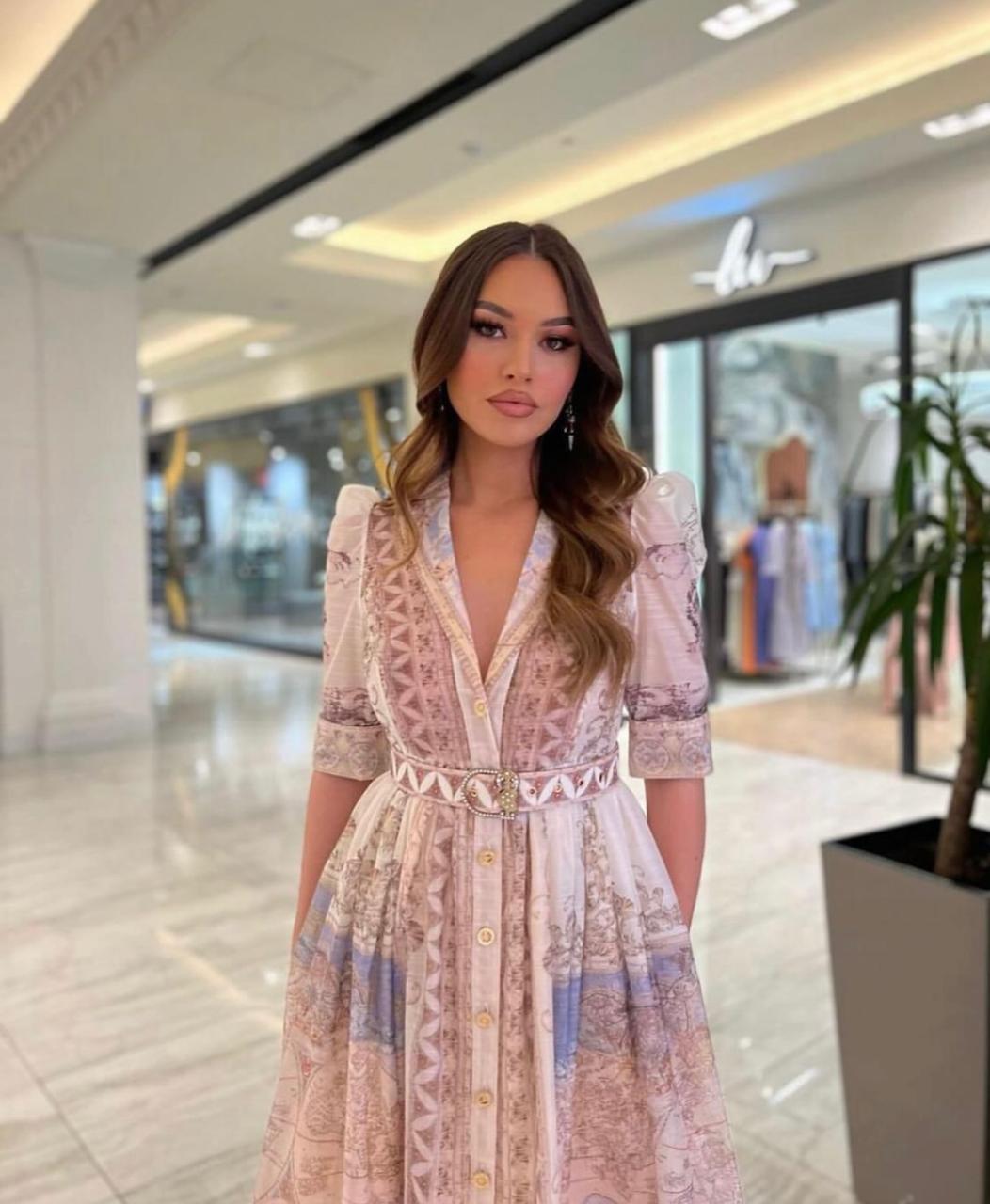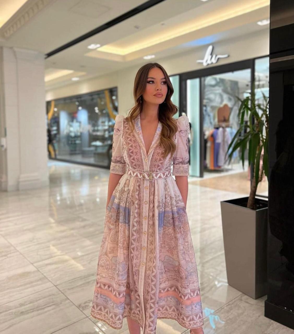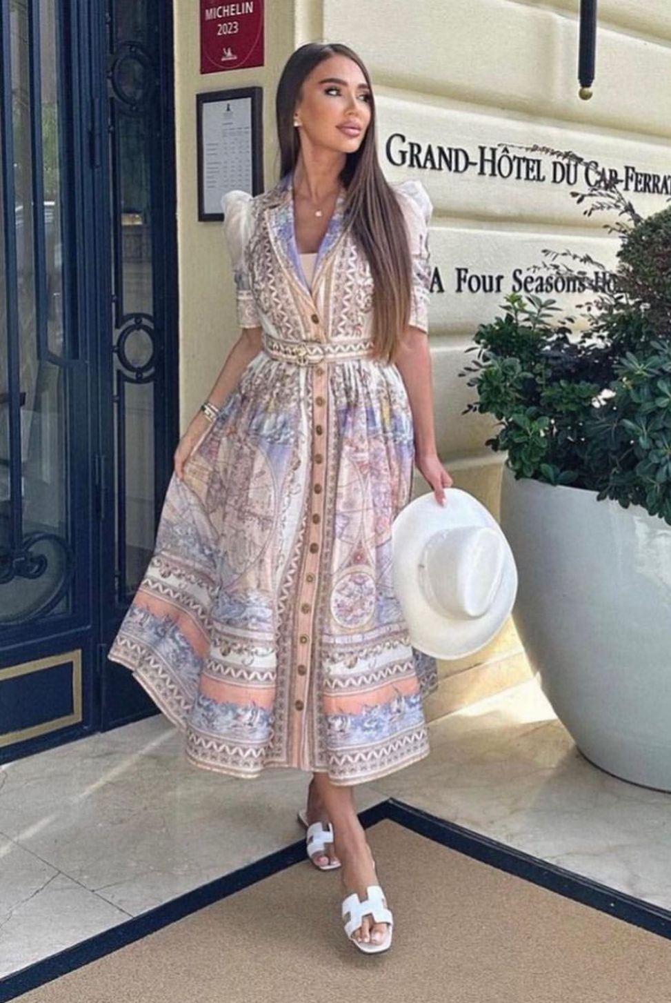 Long maxi dress in organza Long sleeves, doll shape, printed pattern.