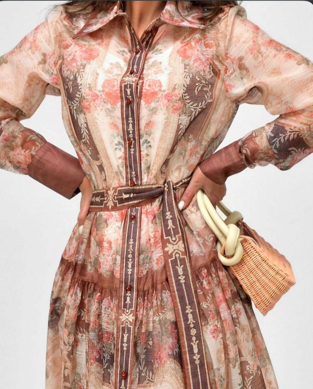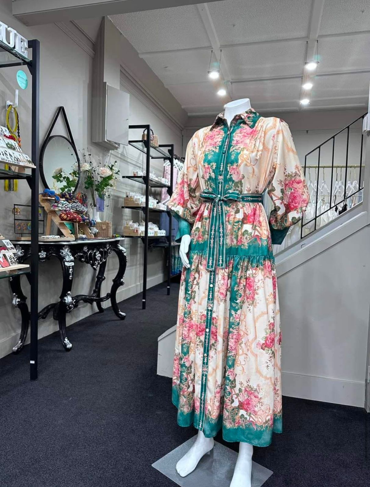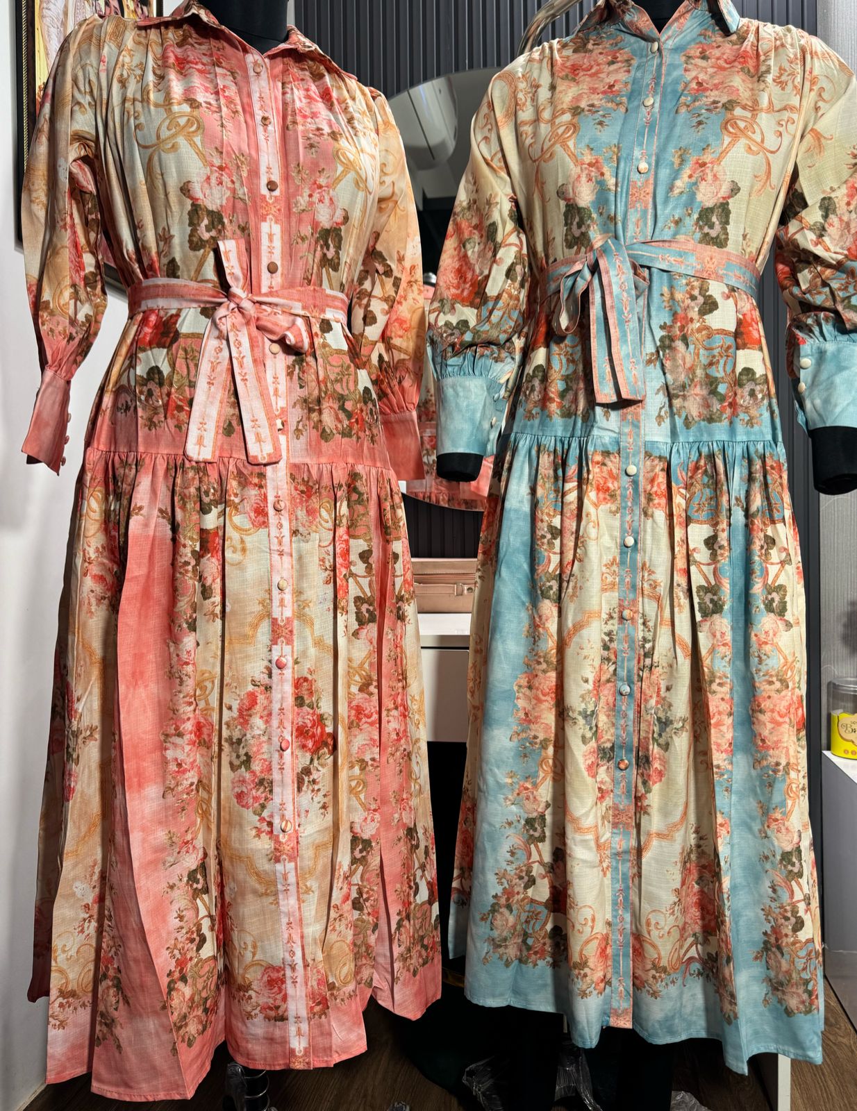 Buttons on the front, same material as the set. Long sleeves, buttoned cuffs. Comes with a cloth rope to tie around the waist. Free size.