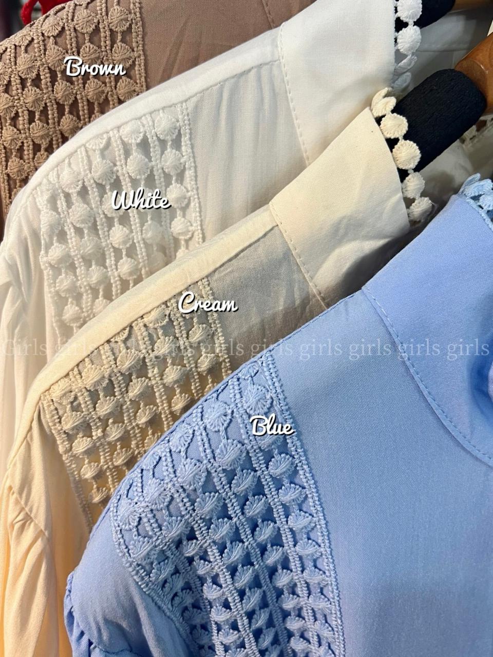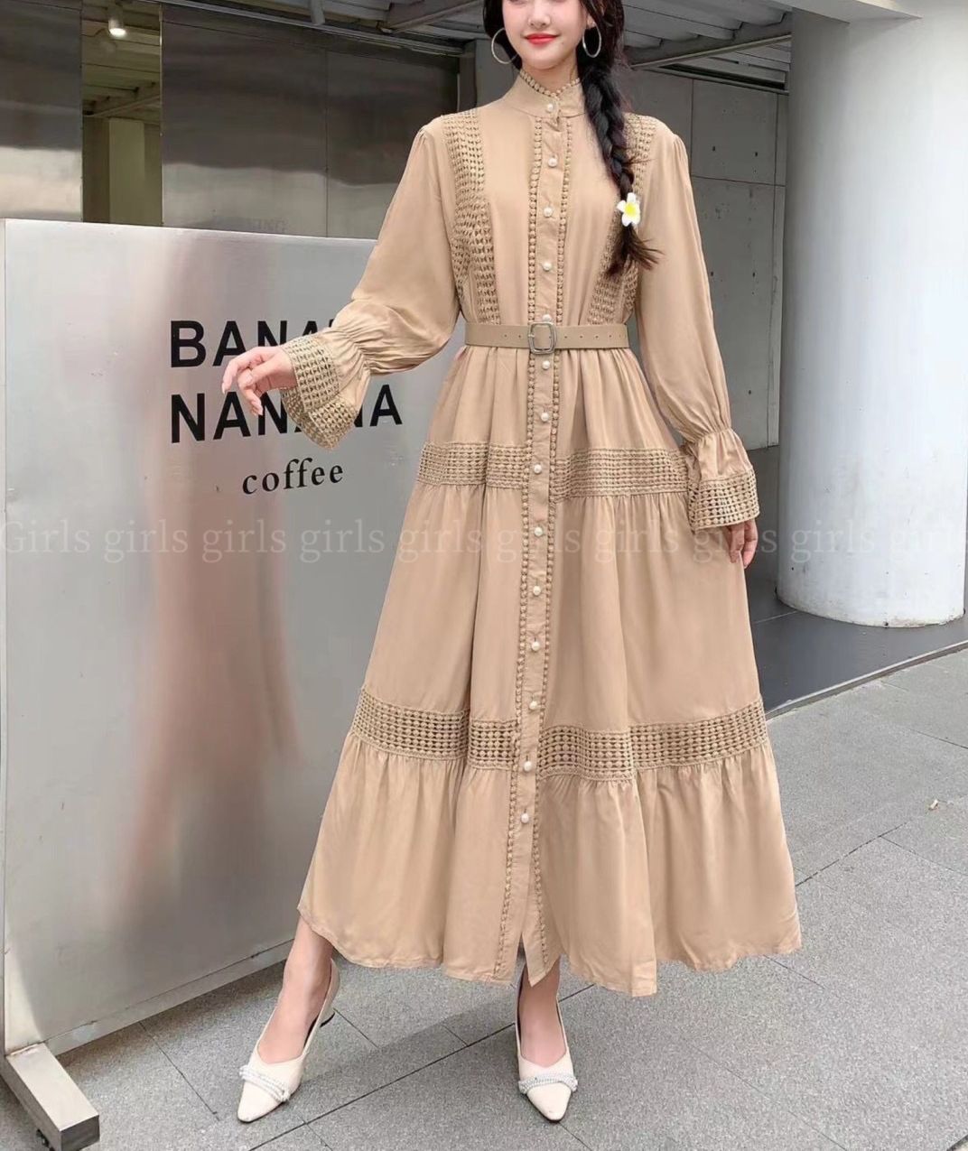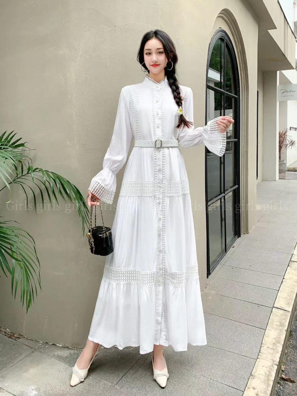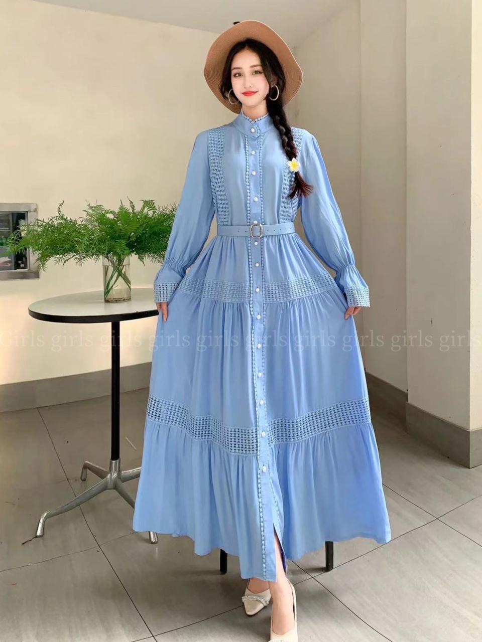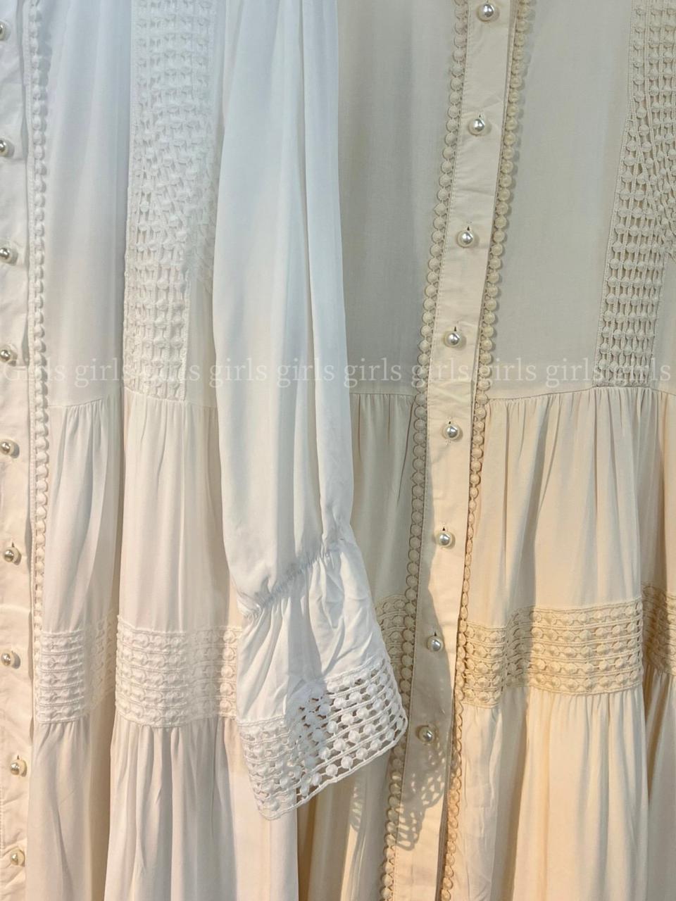 Long maxi dress in solid color Spun fabric decorated with lace Front porch buttoned.