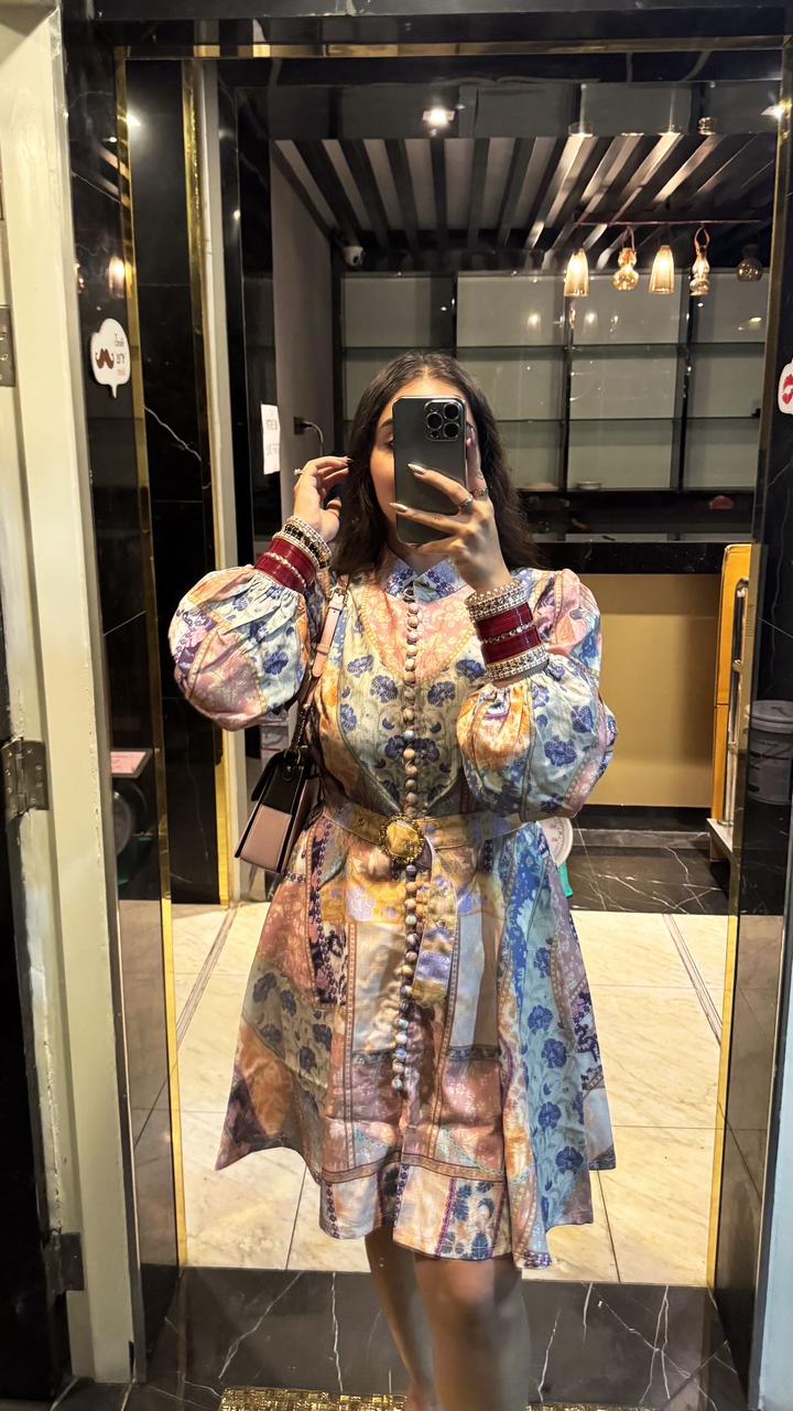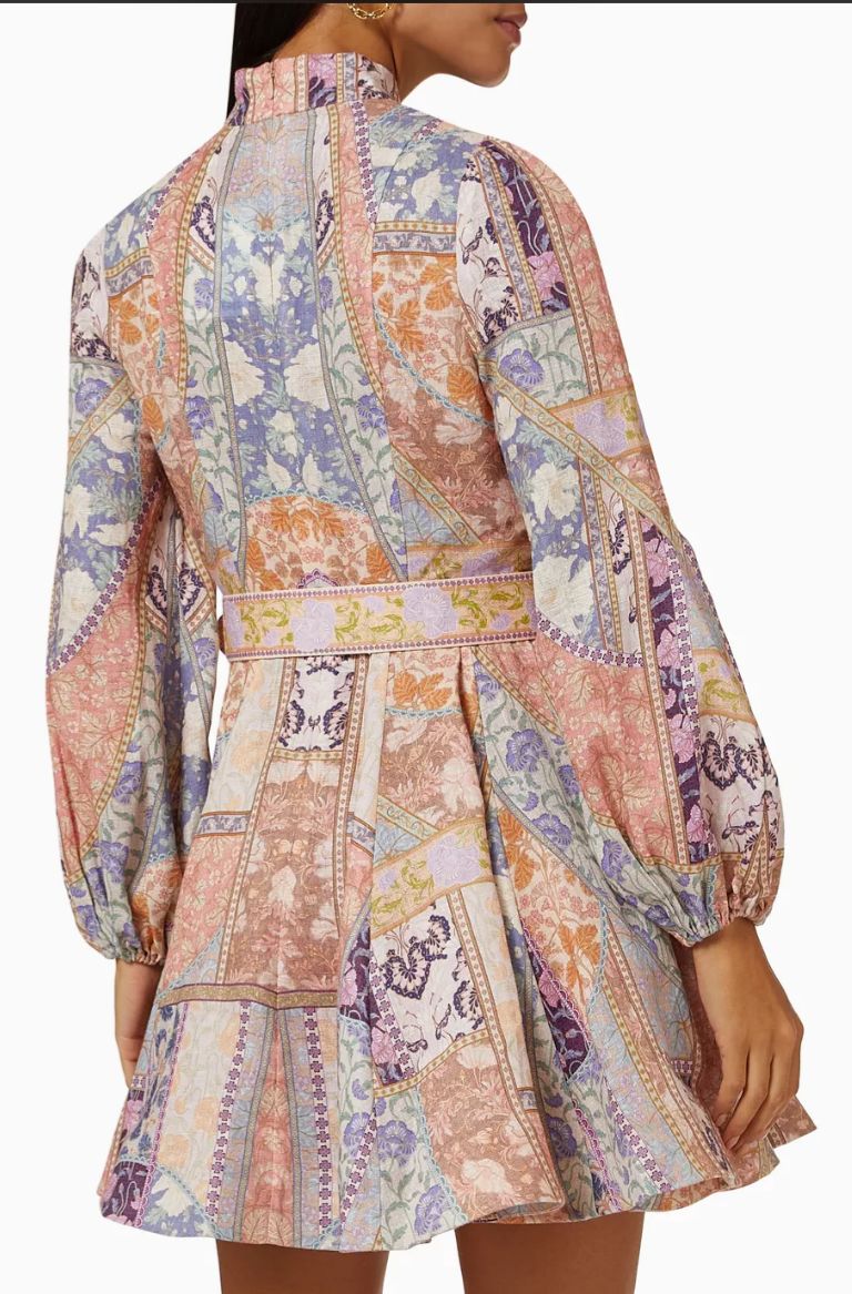 Short dress in printed cotton and linen fabric with Chinese collar.